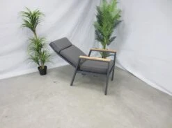 Het frame is van antraciet aluminum, met daartussen het kunstsof textilene materiaal. De armleuningen zijn afgewerkt met teak.